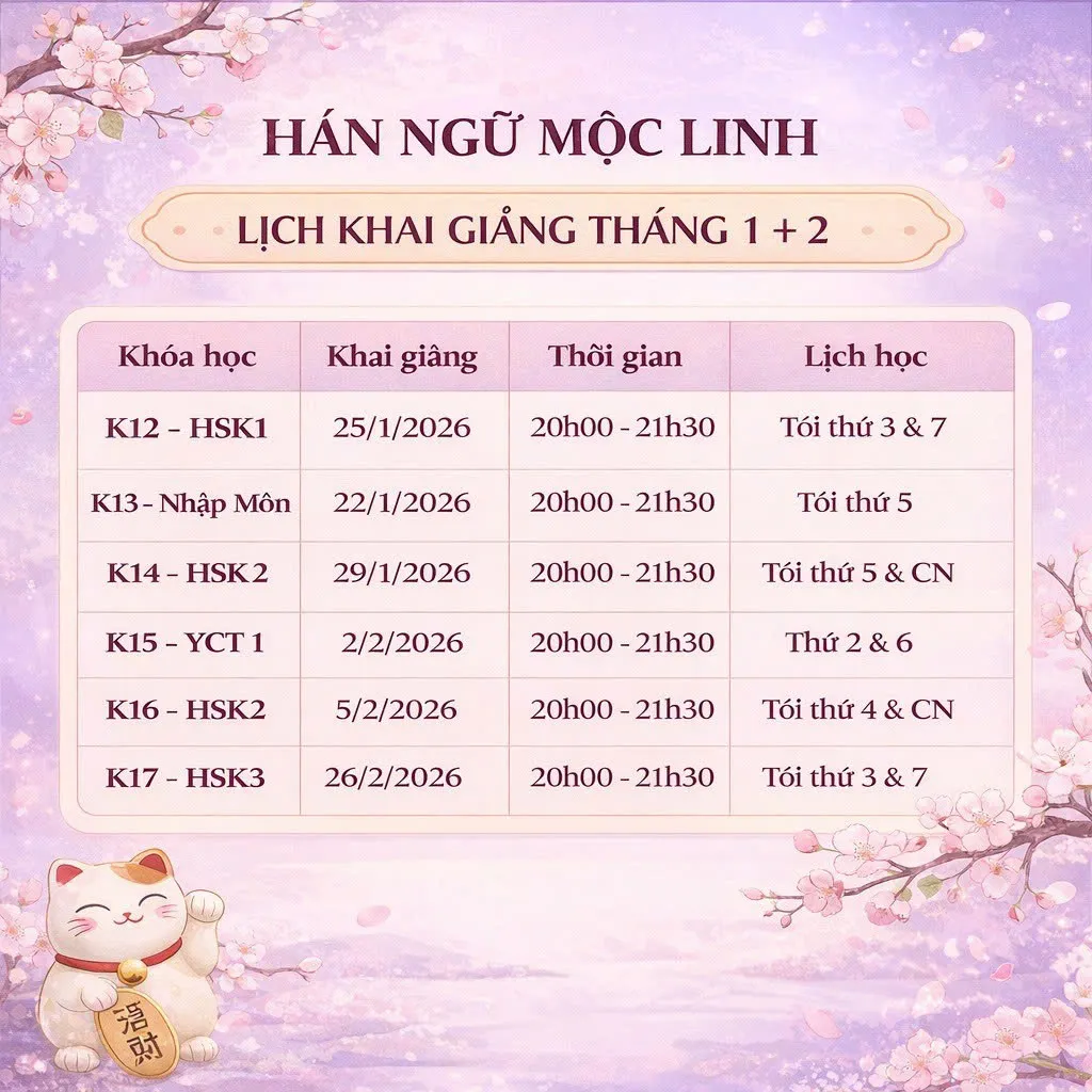 Hán Ngữ Mộc Linh trân trọng thông báo lịch khai giảng các khóa học tiếng Trung mới nhất trong tháng 1 và tháng 2/2026, phù hợp cho nhiều đối tượng học viên từ nhập môn, thiếu nhi đến luyện thi HSK. Các lớp được tổ chức khung giờ tối linh hoạt, giúp học viên dễ dàng sắp xếp thời gian học tập song song với công việc và học tập.